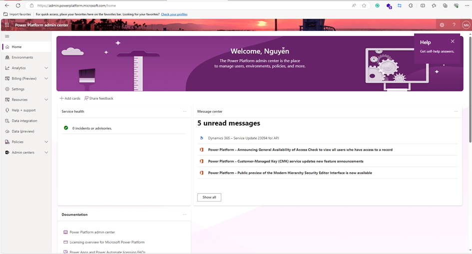 Bước 1: Truy cập vào Power Platform Admin Center bằng đường dẫn sau: https://admin.powerplatform.microsoft.com
