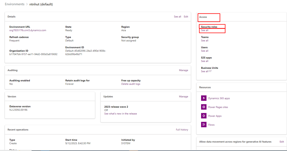Bước 4: Tại mục Access ==> chọn mục Sercurity roles ==> chọn See all để có thể show ra các tính năng: