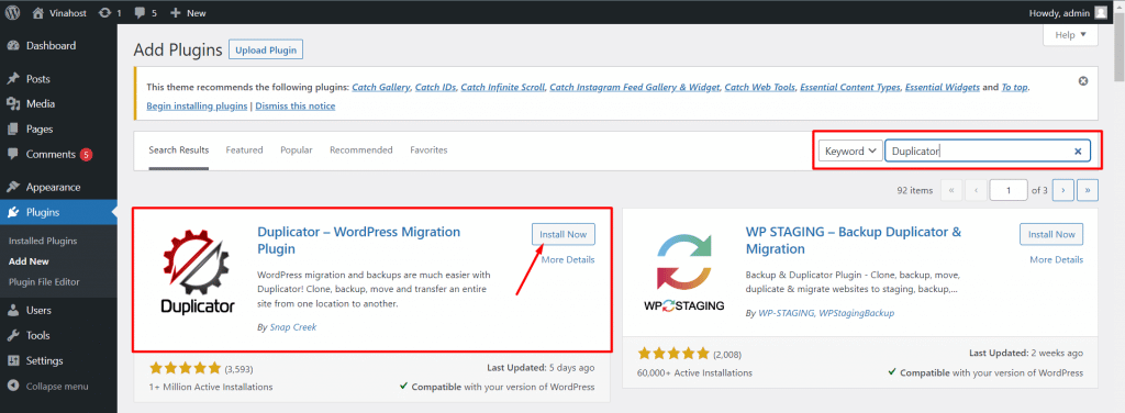 Ta tiến hành cài Plugin Duplicator từ thư viện Plugin WordPress