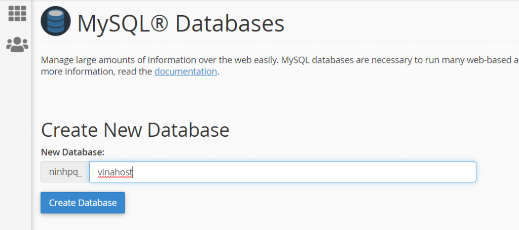 Bước tiếp theo bạn tạo 1 database rỗng mới hoàn toàn tại phần MySQL Databases. Nhập tên database và nhấn Create Database để tạo một database mới.