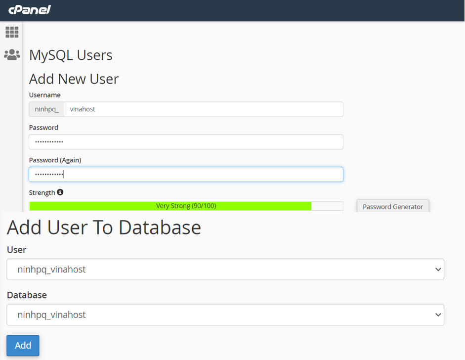 Tiếp theo ta sẽ tạo user và add user đó vào database vừa tạo.