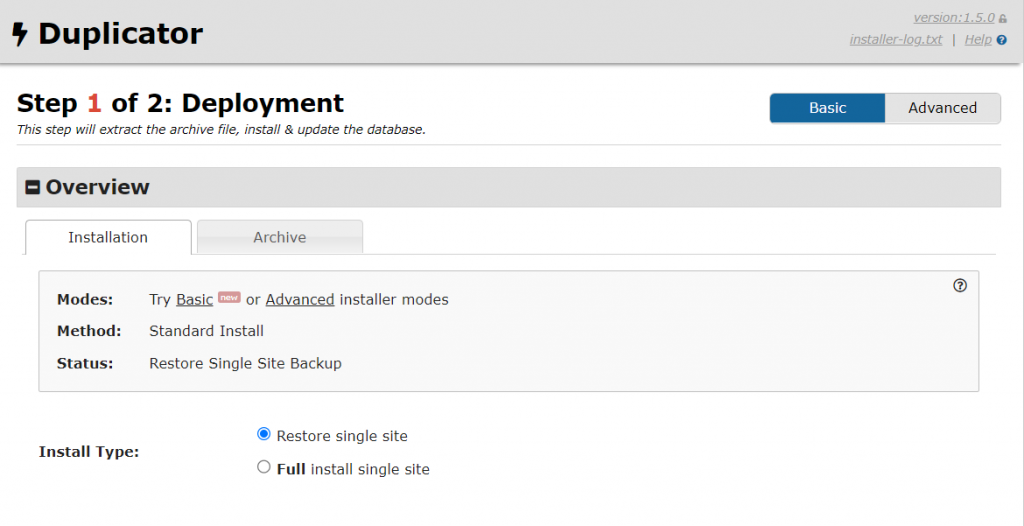 Chọn kiểu cài đặt: Restore một site hay tất cả site