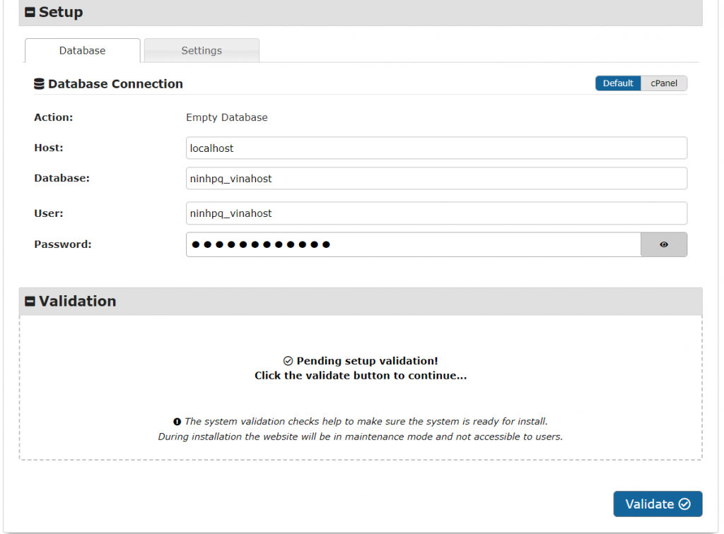 - Database: Nhập vào tên database rỗng đã tạo trước đó