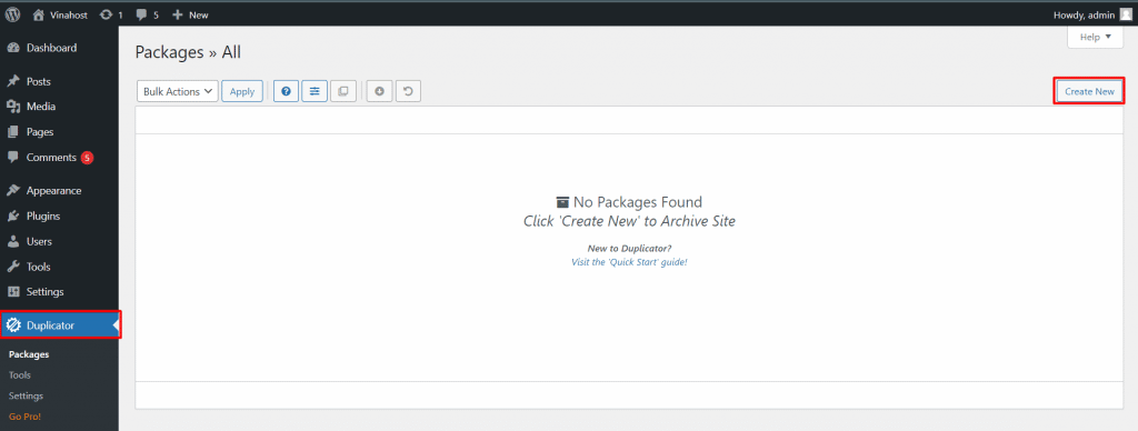 Sau khi cài đặt xong, bạn click vào Duplicator => Create New để tạo bản sao mới