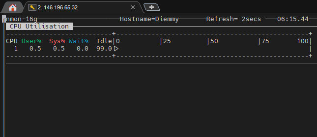 Ở đây sẽ hiển thị hostname bạn cài đặt nmon, làm mới sau mỗi 2 giây, thông tin hiển thị % sử dụng, % chờ.