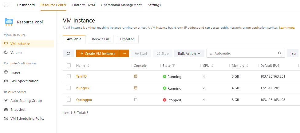 - Truy cập Resource Center > ResourcePool > VM Instance