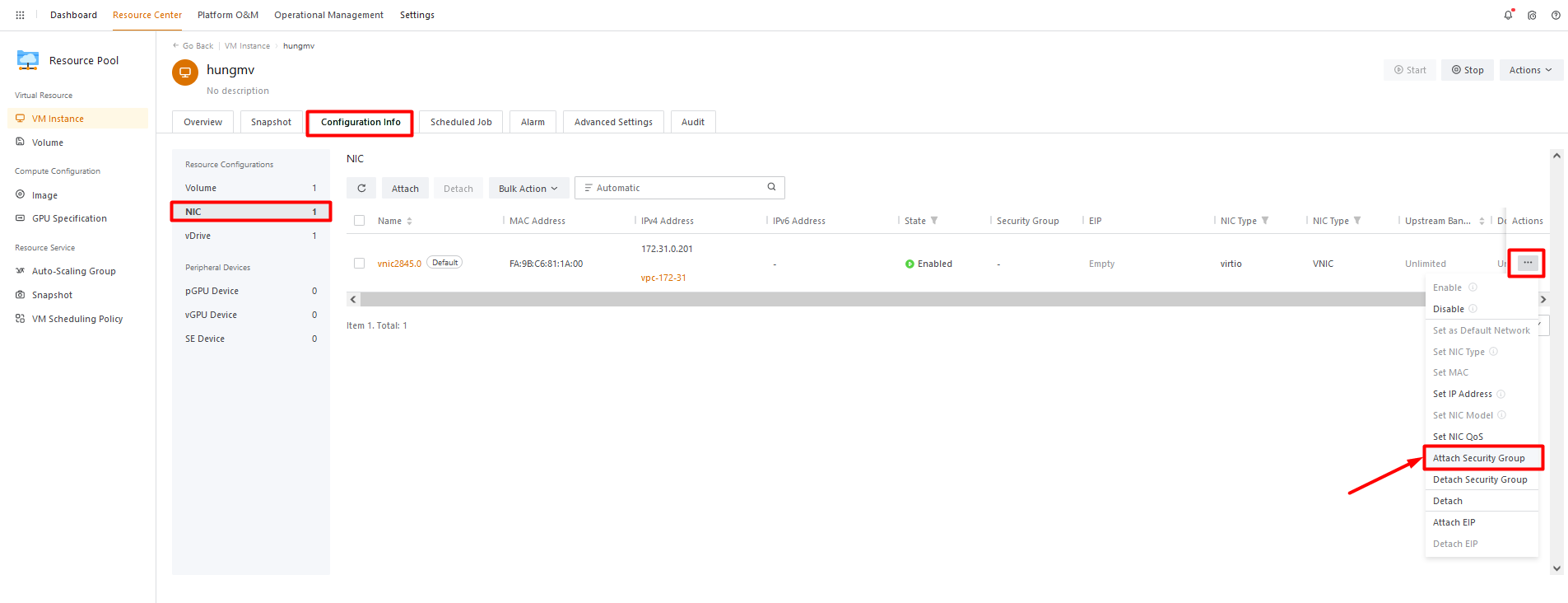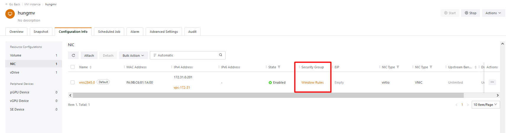 - Chọn VM cần gán Security Group > Vào tab Configuration Info > NIC > Attach Security Group (tương tự, chọn Detach để gỡ SG)