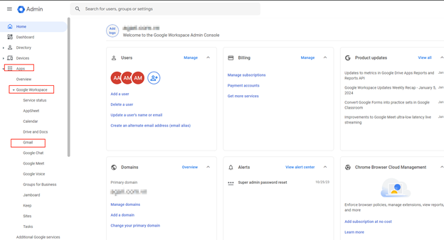 Bước 1: Truy cập vào giao diện quản trị Apps > Google Workspace > Gmail#