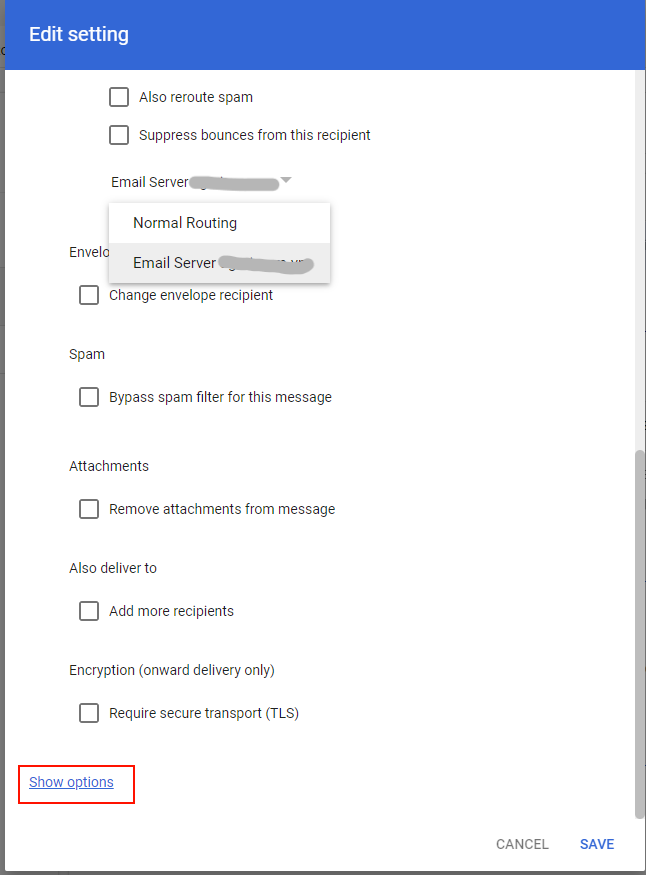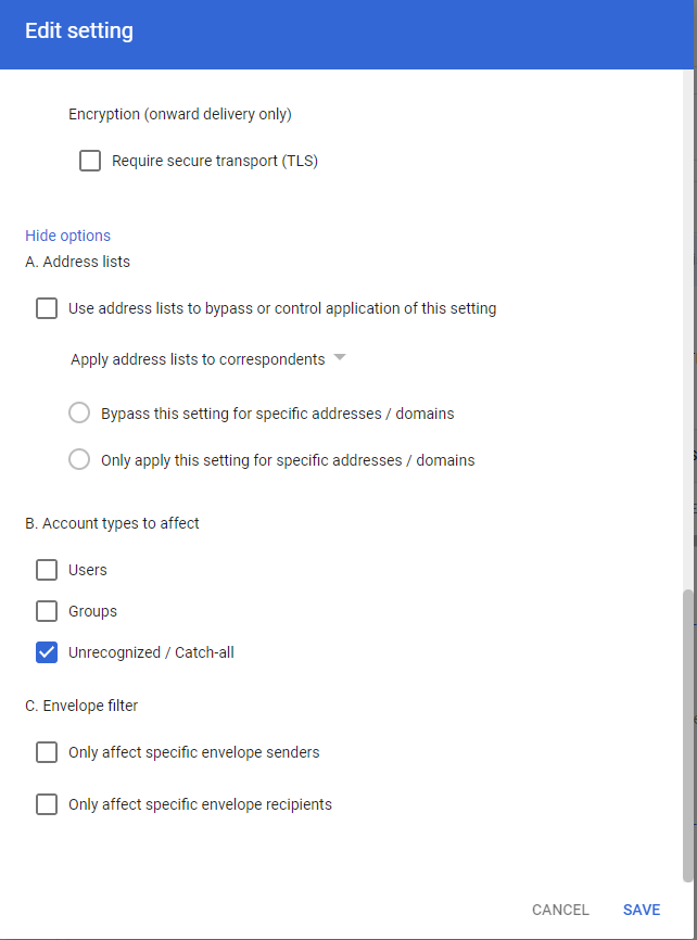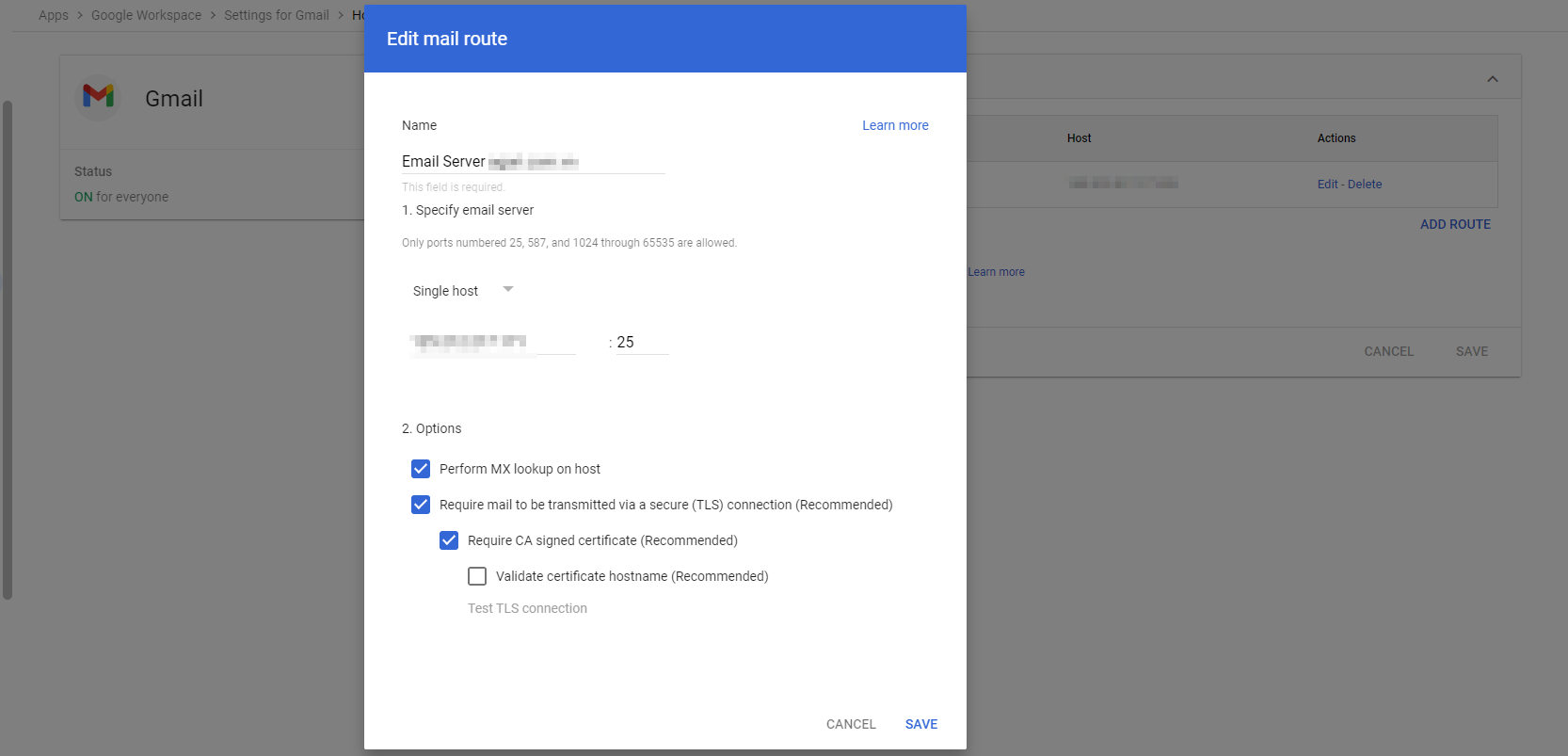 Các tùy chọn được Đề xuất được bật theo mặc định cho các đường route: - Perform MX lookup on host : Gửi tới máy chủ được liên kết với domains đã nhập. Nếu đã nhập một miền, hãy chọn hộp này để xác minh bản ghi MX của máy chủ và gửi tới máy chủ trong bản ghi MX của miền. Nếu bạn đã nhập máy chủ email, hãy bỏ chọn hộp này. - Require mail to be transmitted over a secure transport (TLS) connection: Mã hóa thư giữa máy chủ gửi và máy chủ thư nhận bằng Bảo mật lớp truyền tải (TLS). - Require CA signed certificate: Máy chủ SMTP của khách hàng phải xuất trình chứng chỉ được Cơ quan cấp chứng chỉ ký và được Google tin cậy. - Validate certificate hostname :Xác minh rằng tên máy chủ nhận khớp với chứng chỉ do máy chủ SMTP xuất trình.