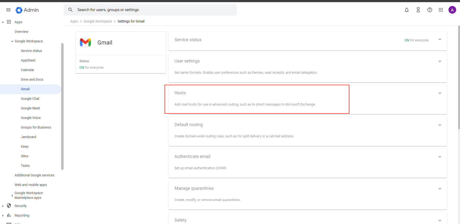 Bước 2: Trong phần Seting for Gmail chọn Host để sử dụng định tuyến nâng cao dành cho Hybrid#