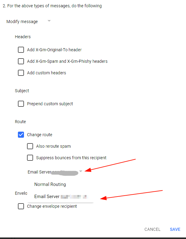 Sau khi vào giao diện Routing trong hộp Routing chọn Configure hoặc Add Another Rule ( nếu thêm đường route khác). Tích chọn vào các option sau. - Email messages to afect.