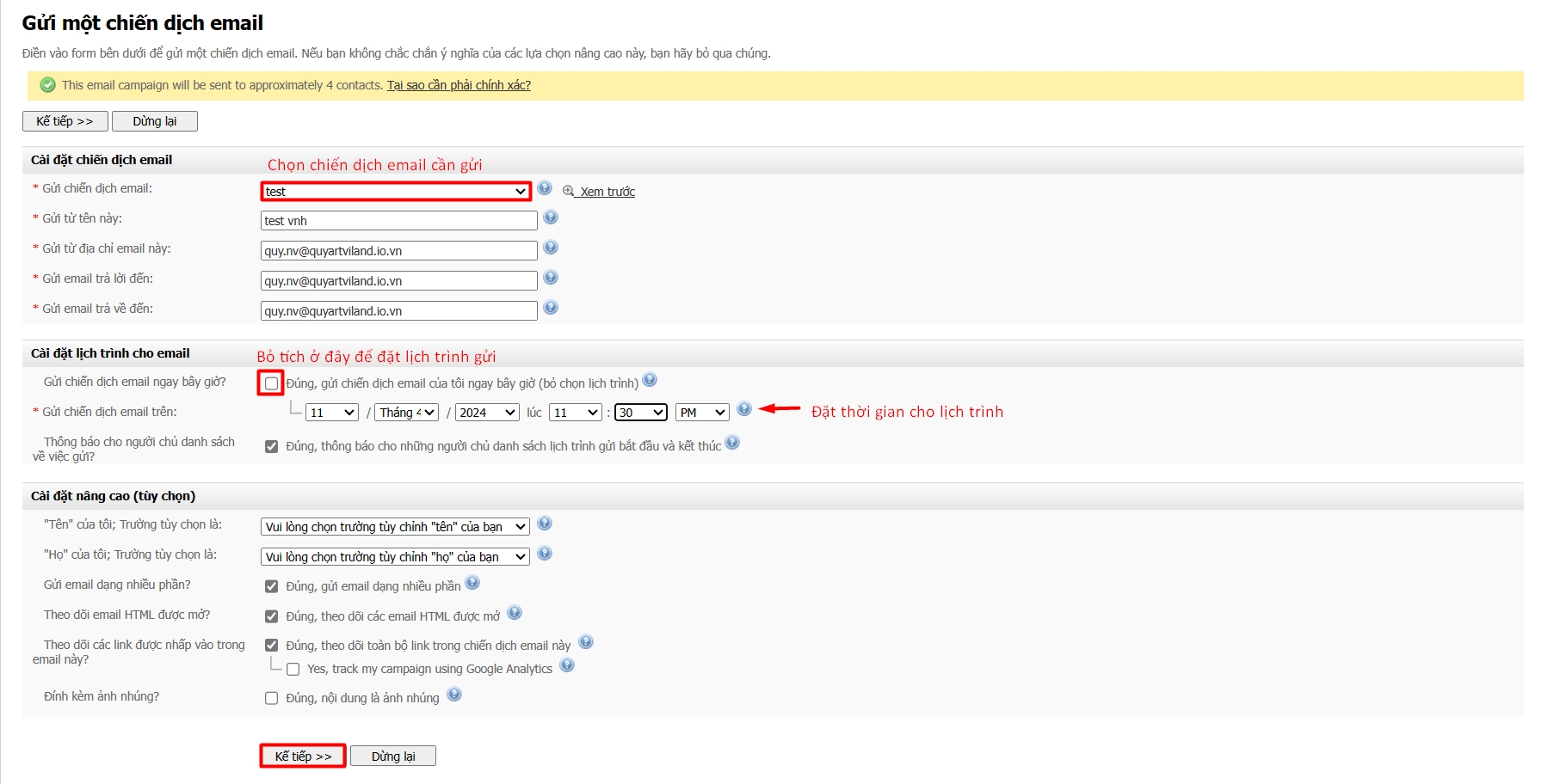 - Bỏ tích ô Gửi chiến dịch email ngay bây giờ?,