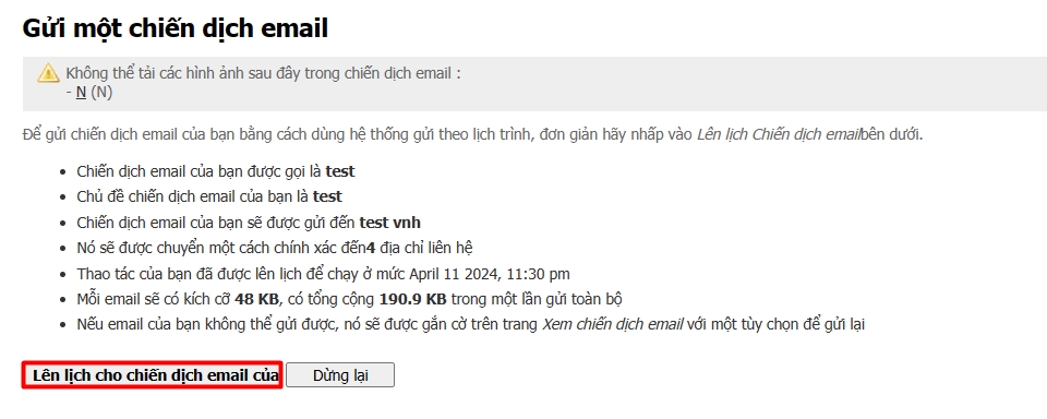 Đây là bước xem lại tổng quan các thông tin của chiến dịch email bao gồm cả thời gian gửi. Nếu các thông tin đã đúng với yêu cầu, nhấn nút Lên lịch... để hoàn tất.