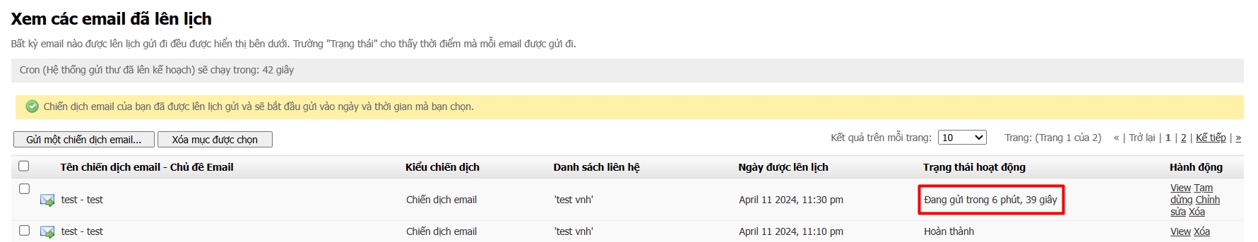Sau bước trên, quý khách sẽ được chuyển tới giao diện Xem các Email đã lên lịch. Tại đây, quý khách có thể thấy được khoảng thời gian còn lại để email được gửi đi.