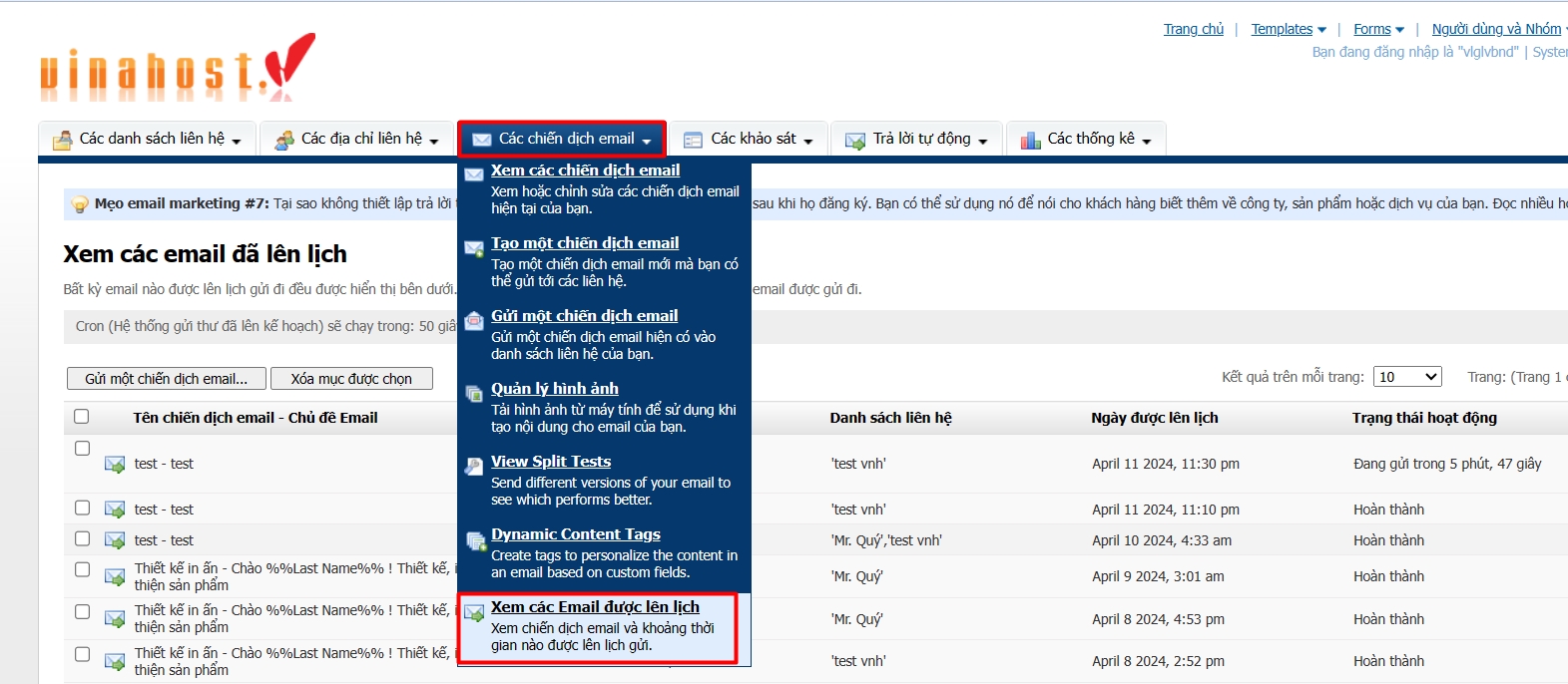 Bài viết này sẽ hướng dẫn bạn Hướng dẫn lên lịch trình để gửi email marketing trên hệ thống của Vinahost. Nếu bạn cần hỗ trợ, xin vui lòng liên hệ VinaHost qua Hotline 1900 6046 ext. 3, email về support@vinahost.vn hoặc chat với VinaHost qua livechat https://livechat.vinahost.vn.