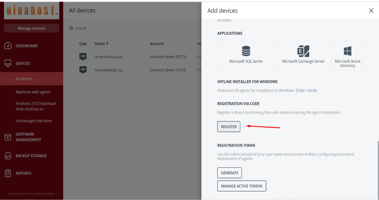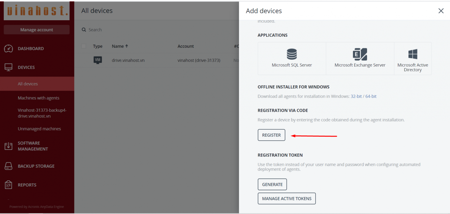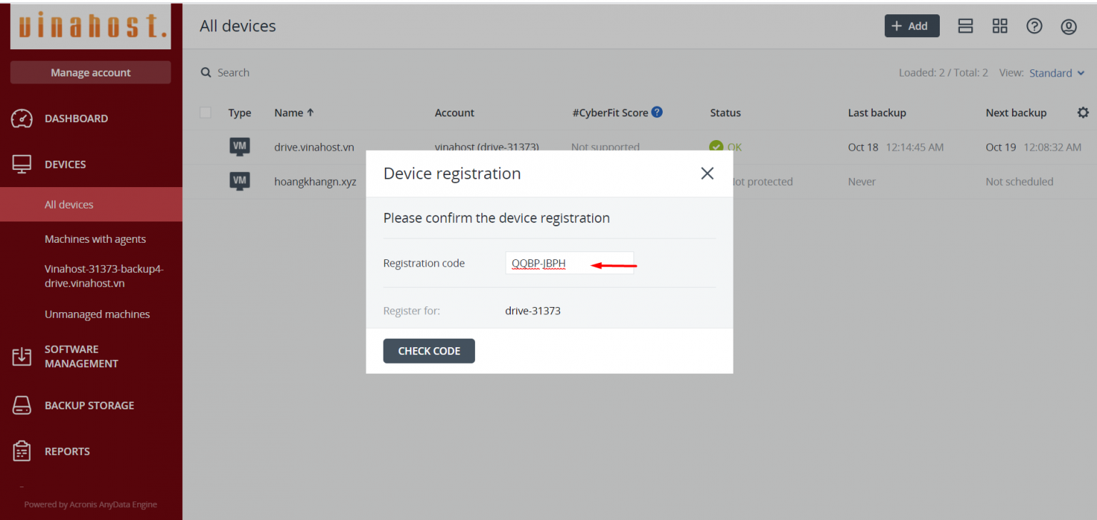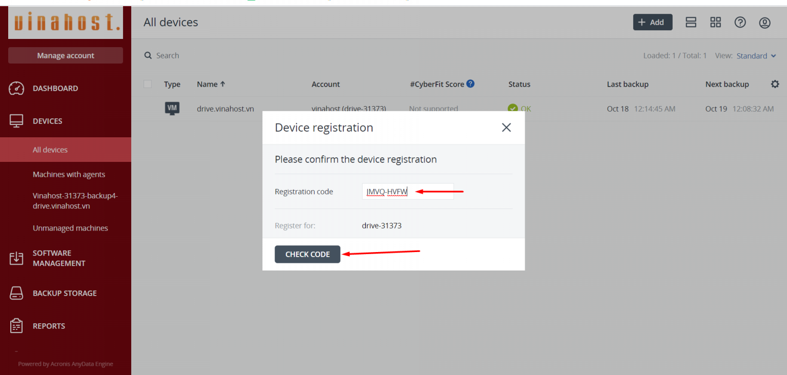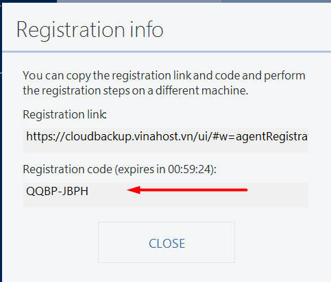 Bước 14: Truy cập lại trang cloudbackup của mình và bấm “Add”, tìm dòng “Registration via Code” và nhấn “Register”: