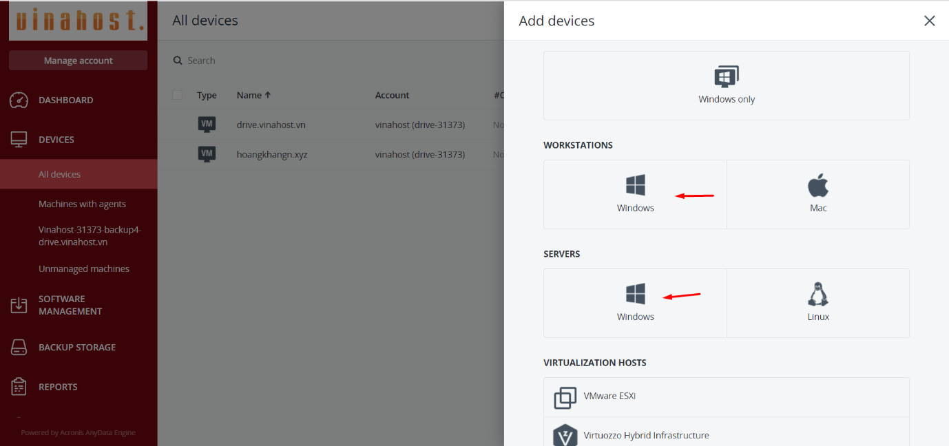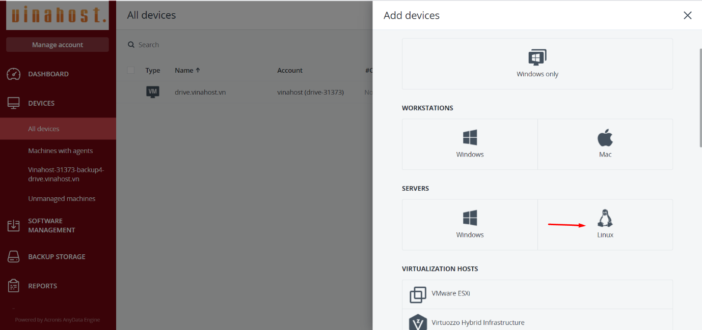 Vì dịch vụ cloud backup hỗ trợ lên tới 20 nền tảng khác nhau nên Vinahost sẽ chỉ hướng dẫn backup máy chủ Windows và Linux của mình bằng Cloud Backup.