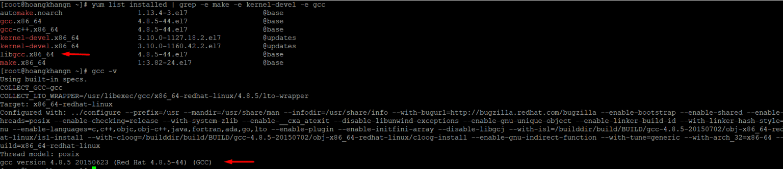 Bước 2: Tiếp tục chạy lệnh sau để kiểm tra make và gcc compiler đã cài đặt hay chưa: make -v gcc –v Sau đó so sánh phiên bản sau khi nhập lệnh “gcc -v” với “cat /etc/proc/version” có bằng nhau hay chưa, nếu chưa trùng thì các bạn cập nhật lên cho trùng nhé.