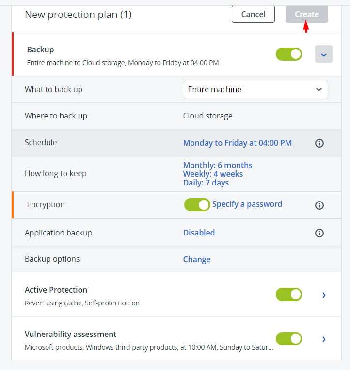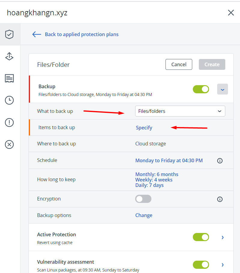 Những mục còn lại thì trang cloudbackup đã thể hiện khá rõ ý nên mình sẽ bỏ qua mục giải thích. Sau khi cấu hình thông số ta chọn “Create”