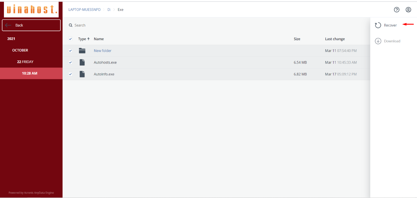 Sau đó ta chọn các thư mục hoặc các tệp tin cần khôi phục, ở mình sẽ chọn tất cả các tệp tin cũng như folder mình đã chỉ định backup từ trước và chọn “Recover”: