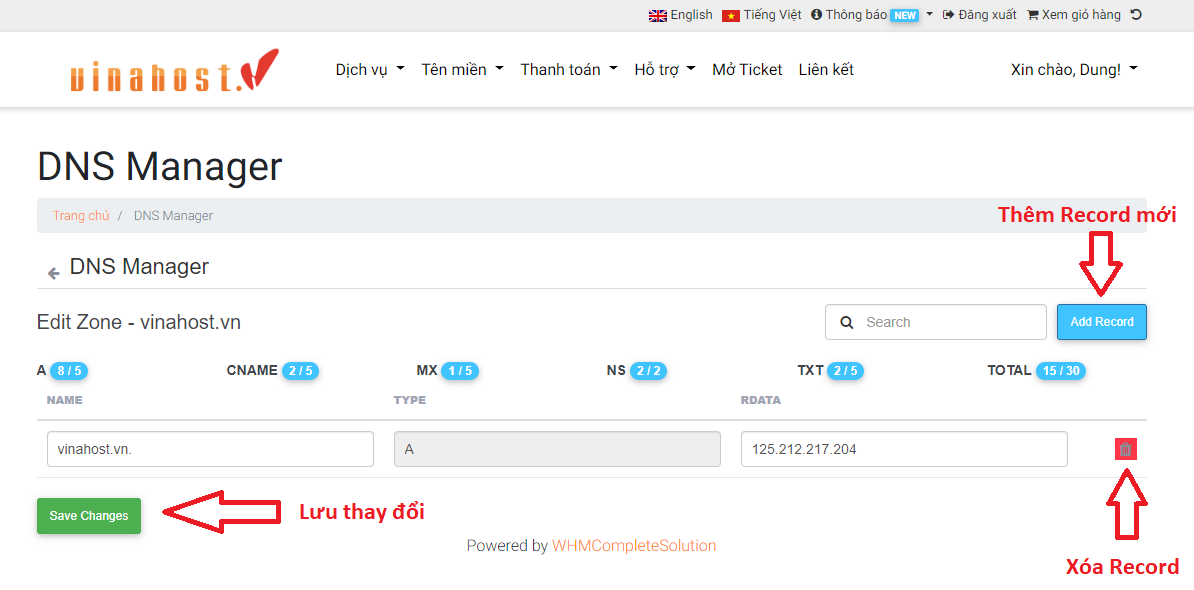 Hướng dẫn sử dụng DNS Manager và quản lý tên miền tại VinaHost