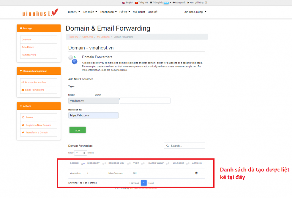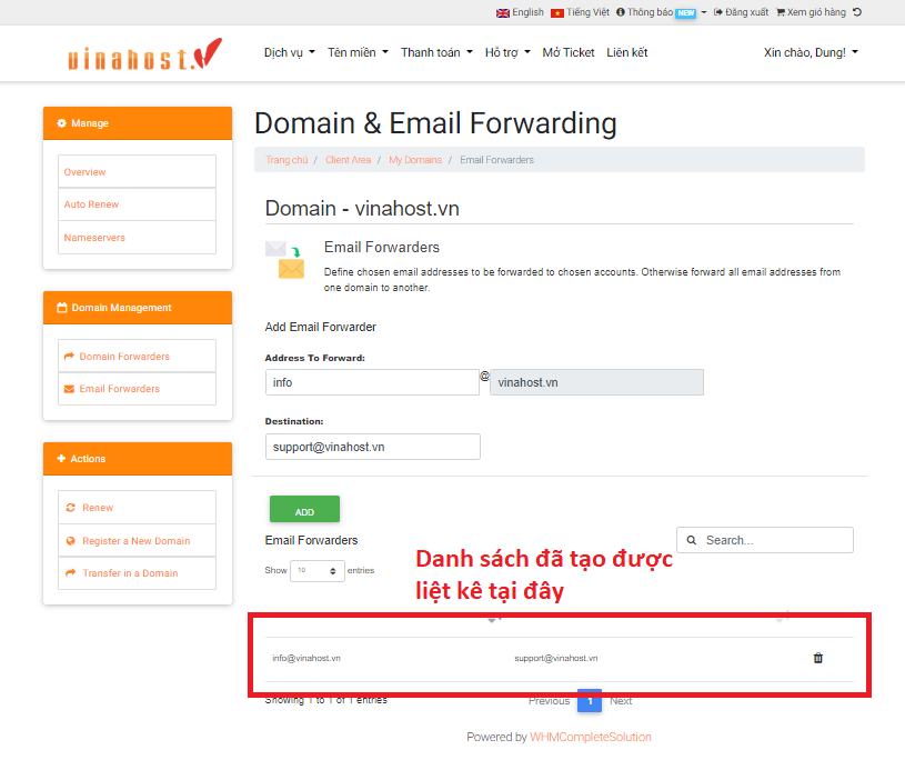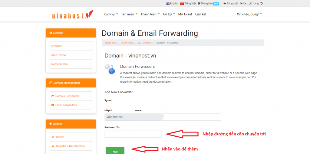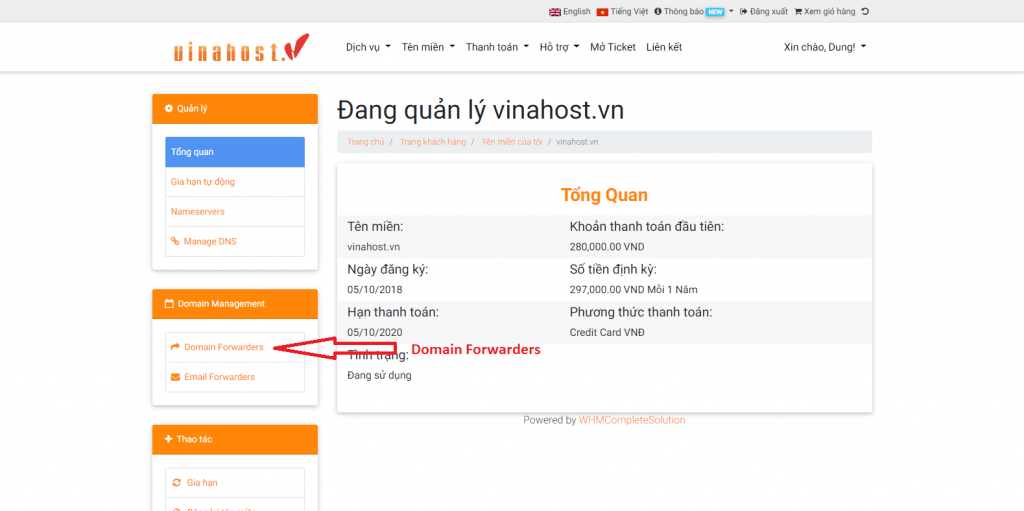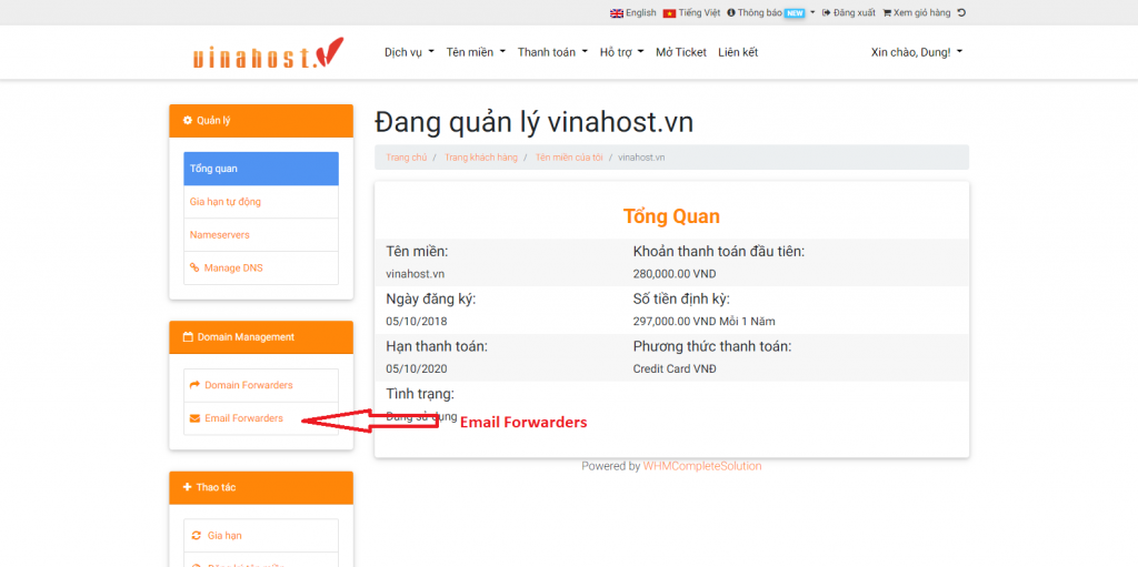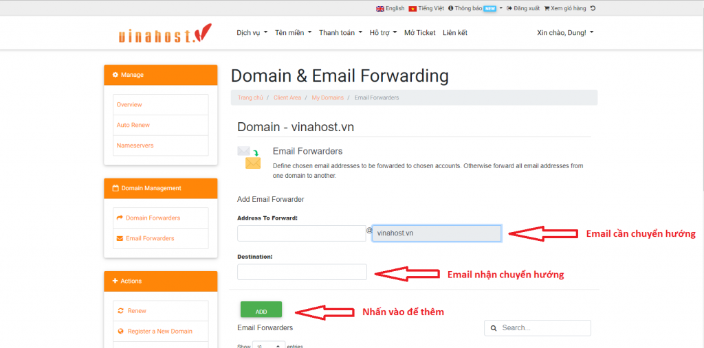 Hướng dẫn sử dụng Domain And Email Forwarding và quản lý tên miền tại VinaHost
