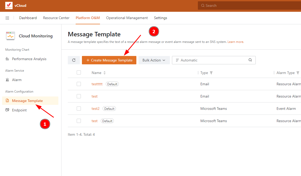 Bài viết này sẽ hướng dẫn bạn cách tạo Message Template Trong vCloud. Nếu bạn cần hỗ trợ, xin vui lòng liên hệ VinaHost qua Hotline 1900 6046 ext. 3, email về support@vinahost.vn hoặc chat với VinaHost qua livechat https://livechat.vinahost.vn/chat.php.