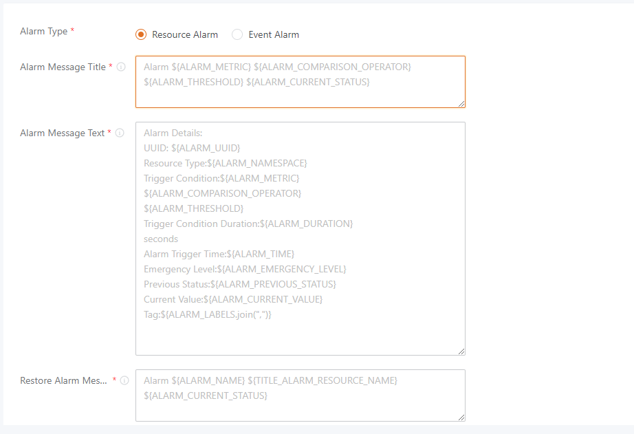 - Ở đây, ta chọn dạng alarm cần điều chỉnh template (resource alarm hoặc event alarm)