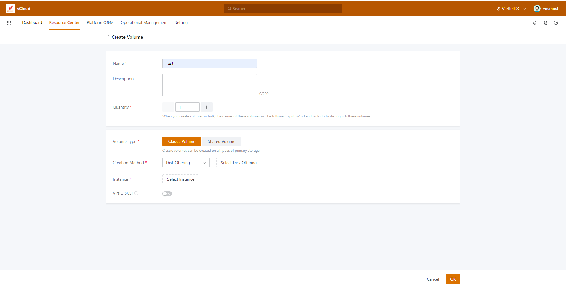 Bài viết này sẽ hướng dẫn bạn cách Thêm Volume Cho VM Instance - vCloud. Nếu bạn cần hỗ trợ, xin vui lòng liên hệ VinaHost qua Hotline 1900 6046 ext. 3, email về support@vinahost.vn hoặc chat với VinaHost qua livechat https://livechat.vinahost.vn/chat.php.