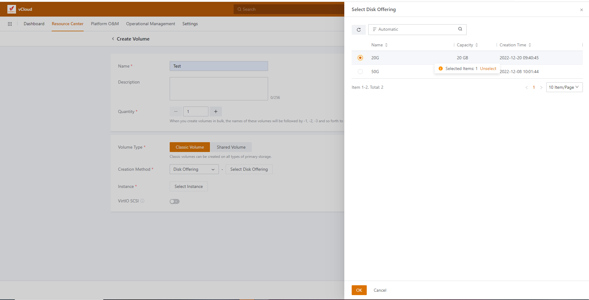 Chọn Select Disk Offering để chọn dung lượng của mỗi disk (trong hình là thêm 1 disk 20G),sau đó nhấn OK