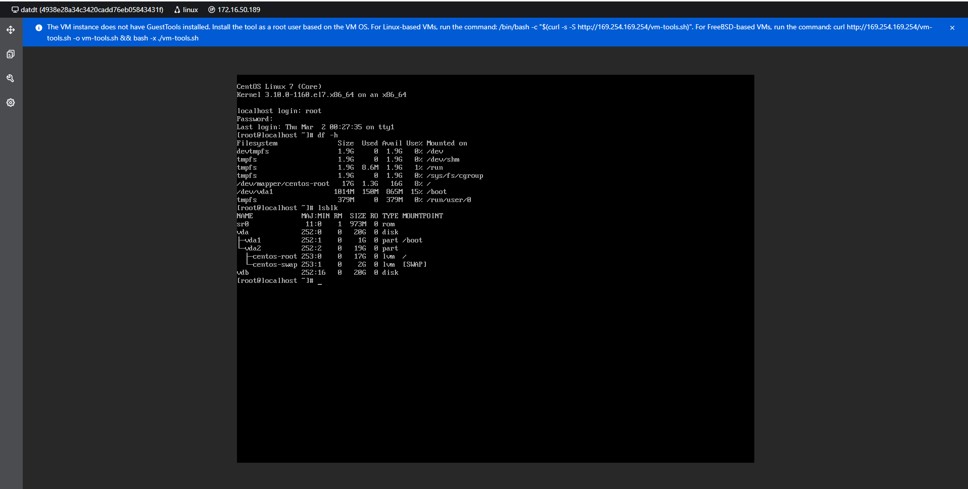 Sau khi thêm volume vào VM để kiểm tra (Vdb là volume mới được thêm vào)