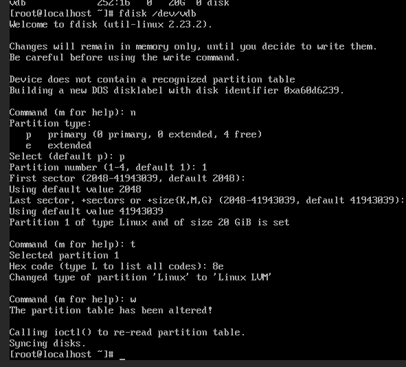 fdisk /dev/vdb (đĩa mới add) n p 1 t 8e w