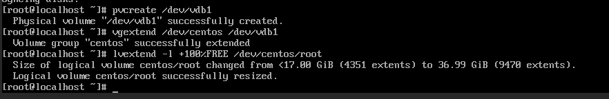 pvcreate /dev/vdb1 vgextend /dev/centos /dev/vdb1 lvextend -l +100%FREE /dev/centos/root