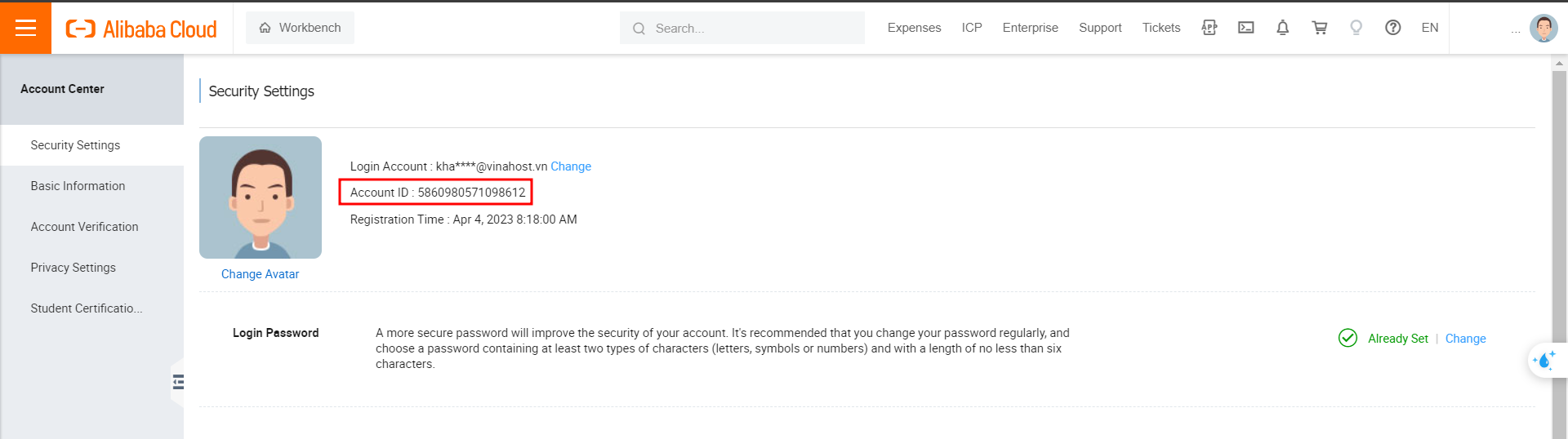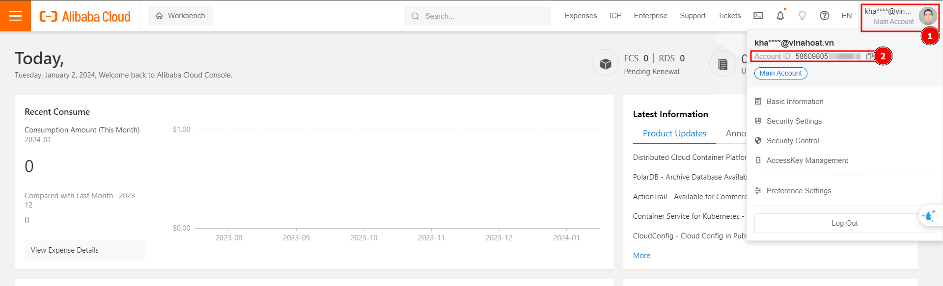Bài viết này sẽ hướng dẫn bạn Tìm UID của một account trên Alibaba Cloud. Nếu bạn cần hỗ trợ, xin vui lòng liên hệ VinaHost qua Hotline 1900 6046 ext. 3, email về support@vinahost.vn hoặc chat với VinaHost qua livechat https://livechat.vinahost.vn/chat.php.