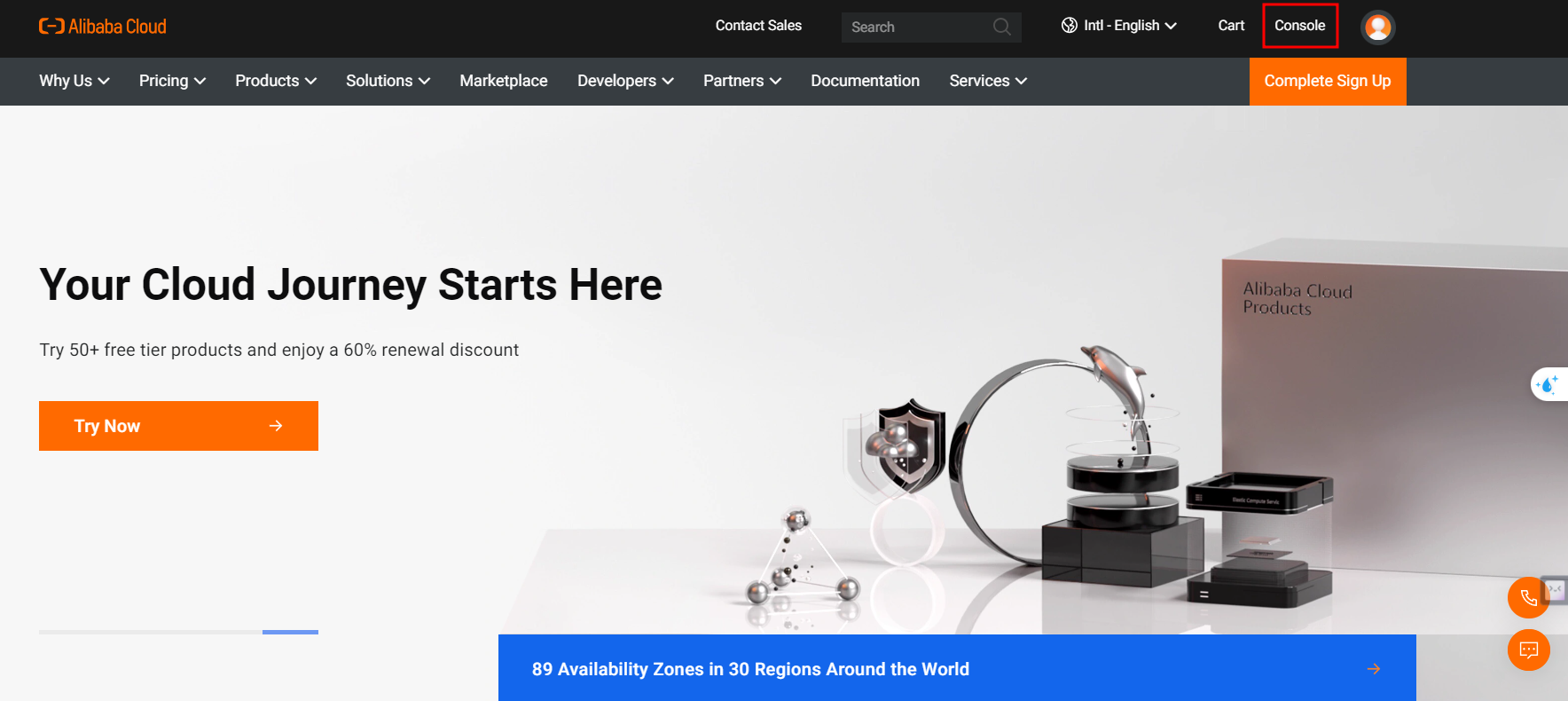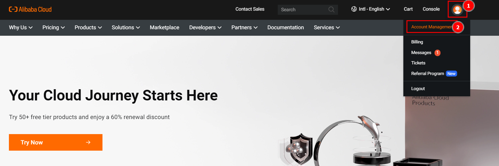 - Đăng nhập tài khoản Alibaba Cloud tại đường link: account.alibabacloud.com.