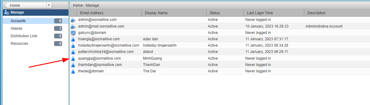 Quay về phần manage (có thể cần reload để nhận thông tin mới) sẽ thấy mail và User vừa được tạo.