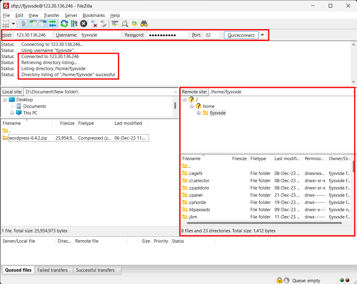 Mở FileZilla và nhập thông tin vào các trường tương ứng: