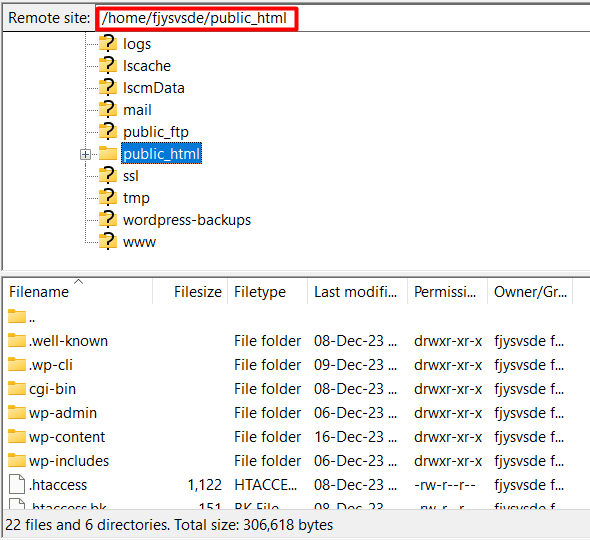 - Phần Remote site hiển thị cây thư mục và các thư mục, tệp của remote host