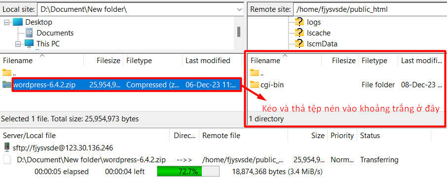 Click vào tệp nén source code, kéo và thả tệp từ phần Local site sang Remote site. Bên dưới sẽ có tiến trình tải tệp từ local host đến remote host.