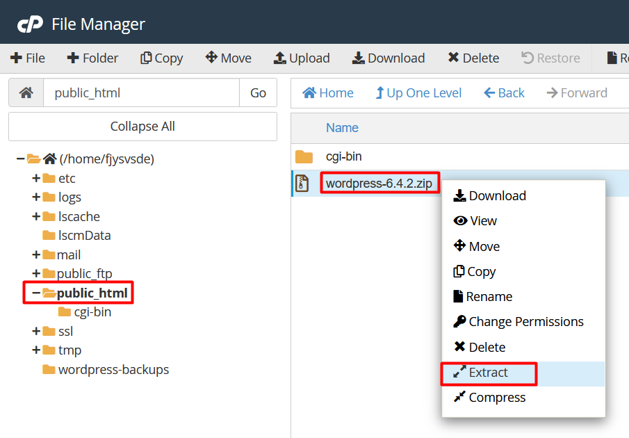 Vào thư mục public_html, click chuột phải vào tệp nén source code và chọn Extract (Giải nén).