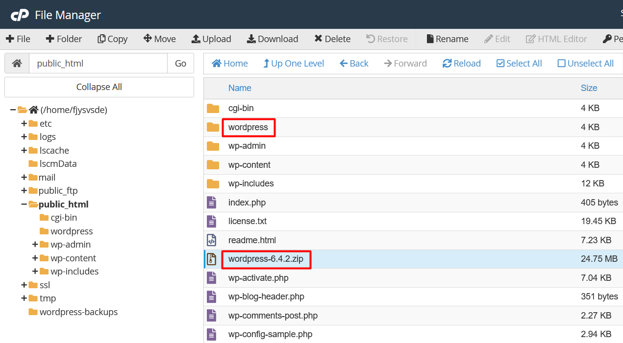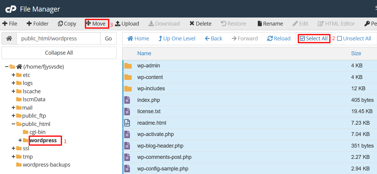 Sau khi giải nén thành công, vào thư mục vừa giải nén, nhấp Select All để chọn tất cả các tệp và thư mục. Tiếp theo, nhấp vào Move để chuẩn bị di chuyển chúng đến public_html.