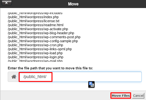 Chú ý, đường dẫn phải là thư mục public_html. Sau đó, chọn Move Files để bắt đầu quá trình di chuyển.