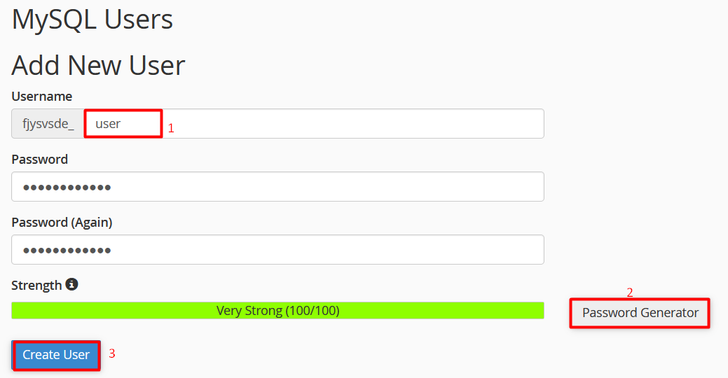 Nhập username, nhập mật khẩu tuỳ ý hoặc chọn Password Generator để tạo mật khẩu mạnh. Chọn Create User.