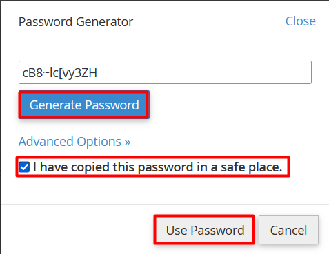 Trong hộp thoại Password Generator, nhấn Generate Password để tạo mật khẩu mạnh. Hãy chắc chắn rằng đã sao chép và lưu lại mật khẩu. Tích vào I have copied... và nhấn Use password.