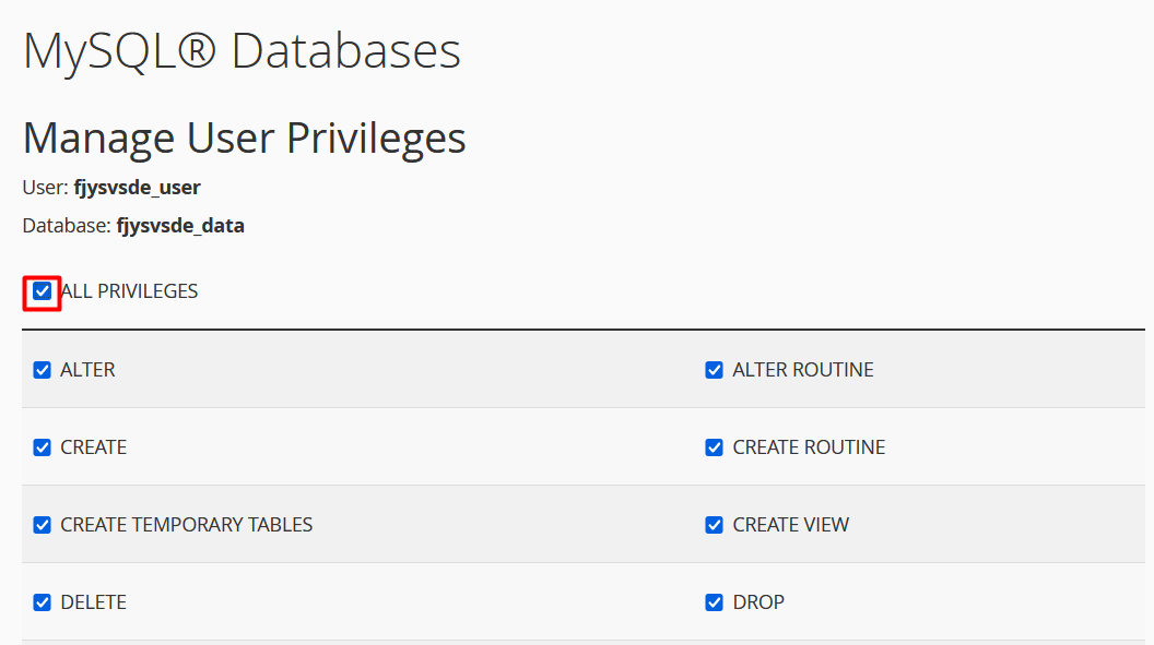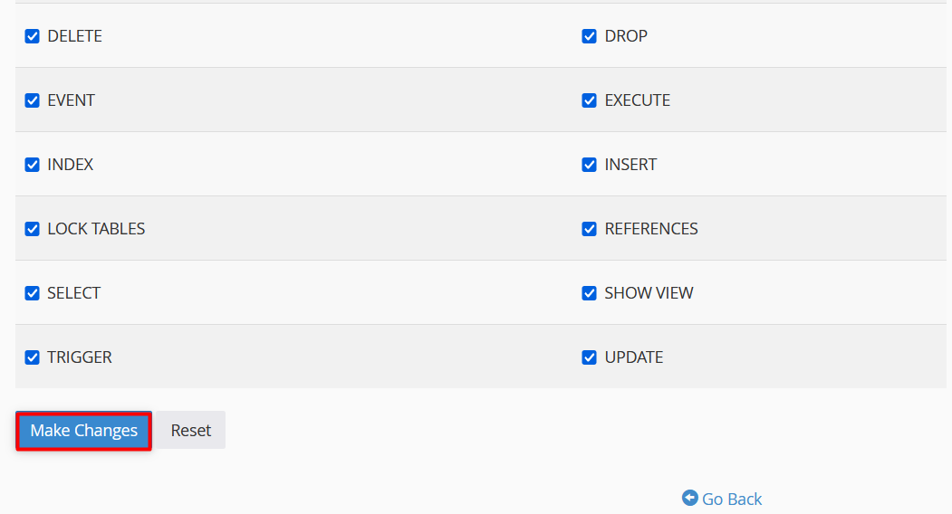 Sau khi nhấn Add, ở giao diện tiếp theo, tích vào ALL PRIVILEGES để gán tất cả các quyền thao tác với database cho user đã chọn. Kéo xuống phía dưới và chọn Make Changes để áp dụng thay đổi.