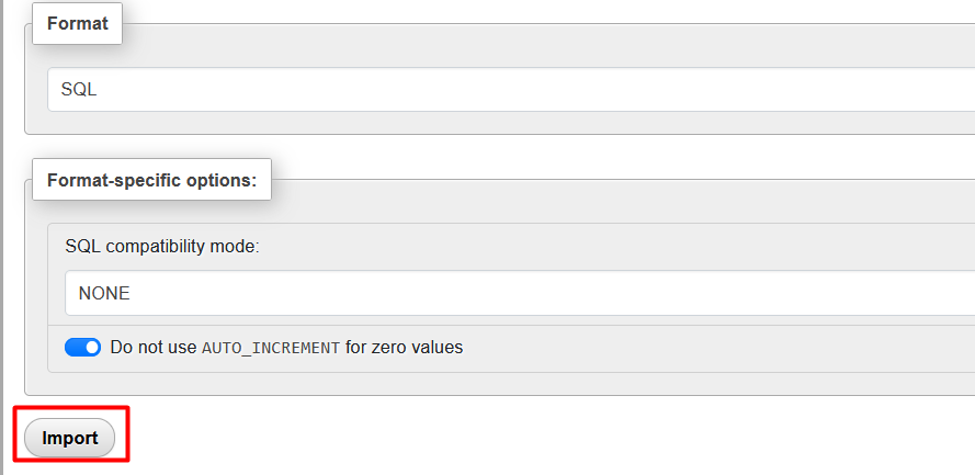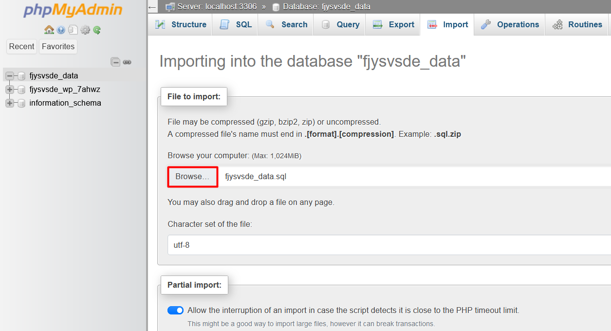 Trong giao diện Import, nhấp vào Browse để chọn tệp database. Sau đó, kéo xuống dưới và chọn Import để bắt đầu quá trình nhập dữ liệu cho database.