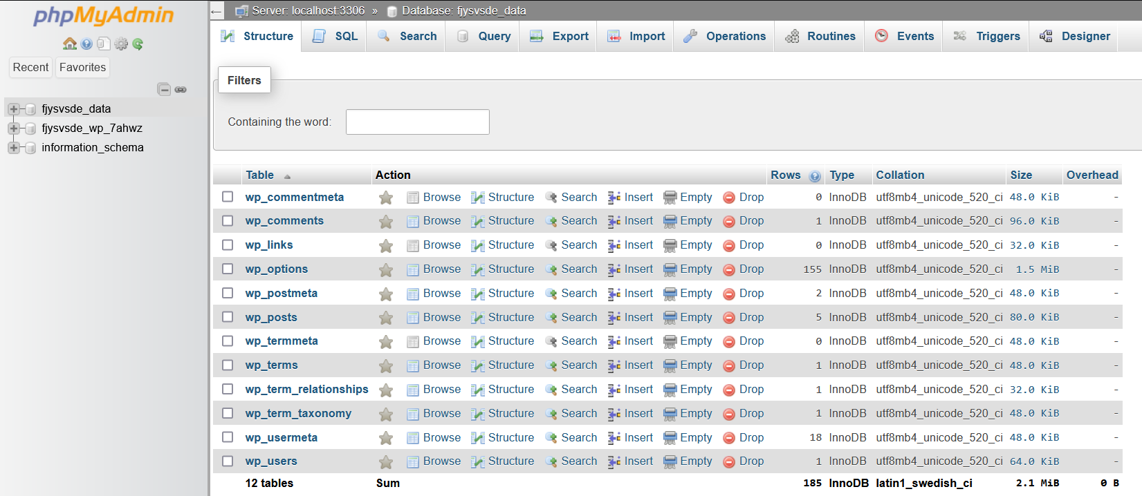 Nếu nhập dữ liệu thành công sẽ thấy các bảng trong database hiện trên màn hình khi chọn vào database đó.