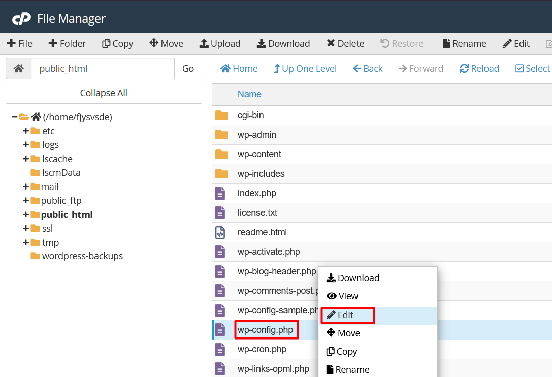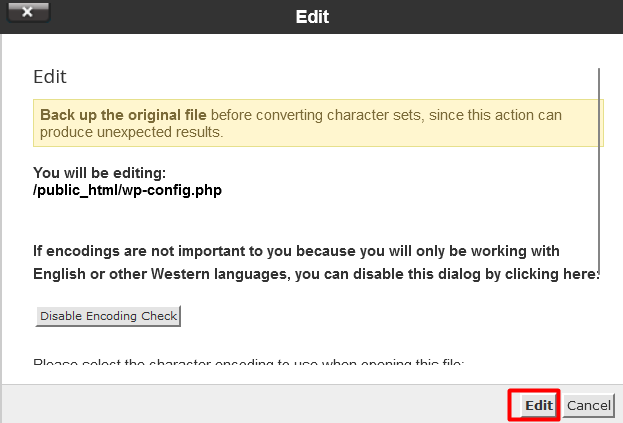 Sử dụng File Manager của cPanel, click chuột phải vào tệp wp-config.php và chọn Edit. Tiếp tục nhấn Edit ở hộp thoại tiếp theo sẽ vào được giao diện chỉnh sửa.
