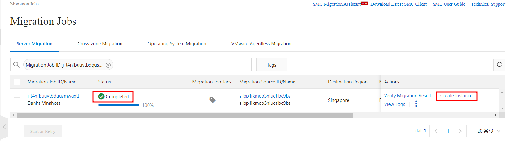 Sau khi trạng thái status đã thông báo Completed thì quá trình migrate đã hoàn thành, có thể chọn Create Instance để tạo một ESC Instance mới trên Alibaba Cloud.