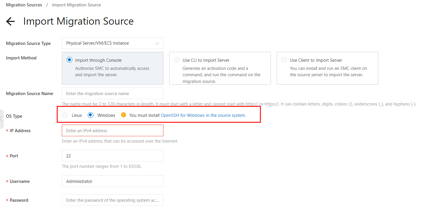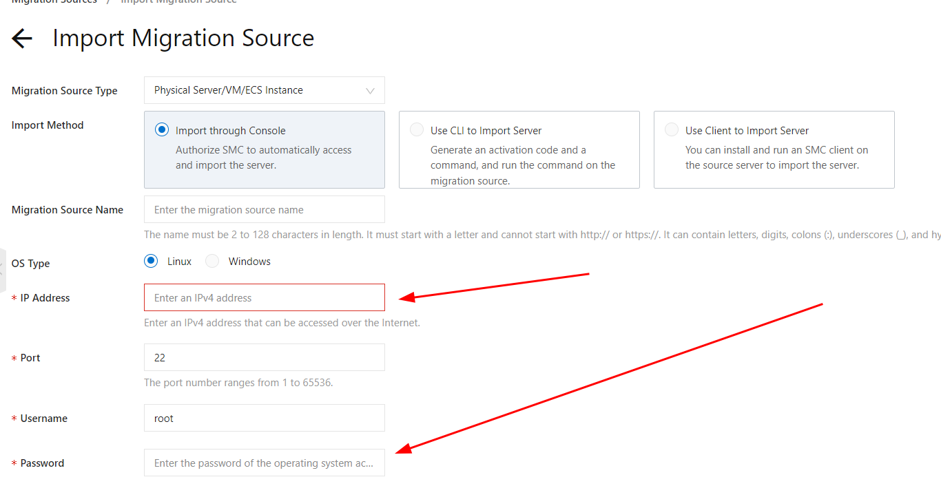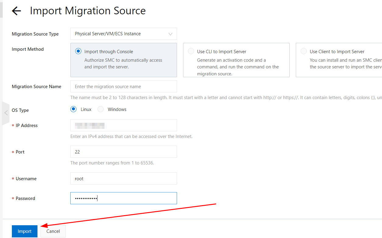 Ở bài này chúng tôi sử dụng Import type là: Physical Server/VM/ECS Instance